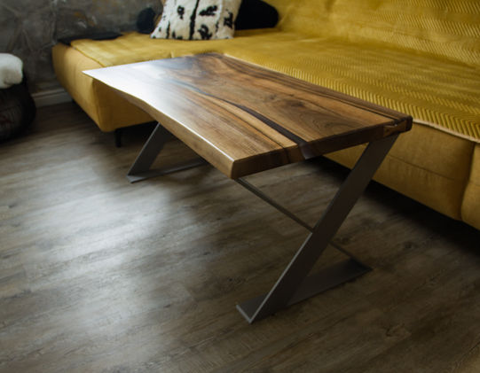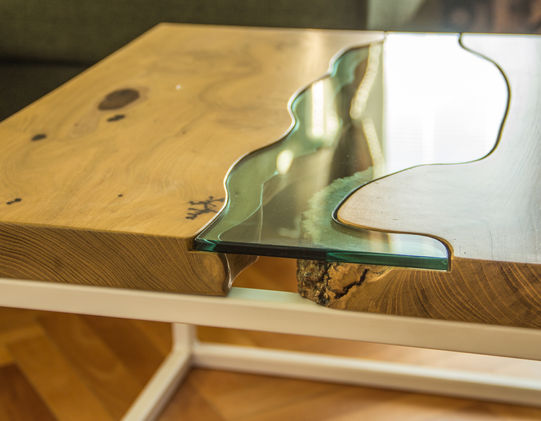 Královský Ořešák s probarveným bezpečnostním sklem spolu s kombinací bíle natřeného dřeva propůjčují stolku jedinečný vzhled, který připomíná písečnou pláž. Malá trhlina na okraji desky je ozdobena tradičním „vlaštovčím ocasem“, který zabraňuje jejímu dalšímu rozšíření.